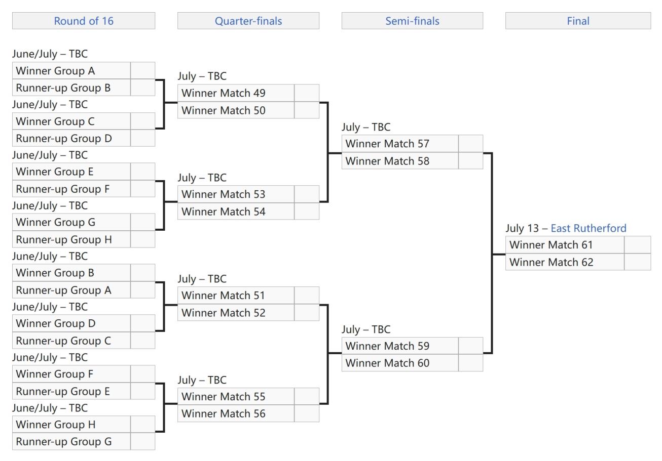 抽签有同协会回避原则,因欧足联有12队参赛,8个小组中将有4个小组有2支欧足联球队。淘汰赛将分为2个独立的半区,半区1包括A、C、E和G组的小组第一,与B、D、F和H组的小组第二配对。半区2则包括B、D、F和H组的小组第一,与A、C、E和G组的小组第二配对。欧足联1-2号球队和南美足联1-2号球队,将被分配到不同半区的小组中。