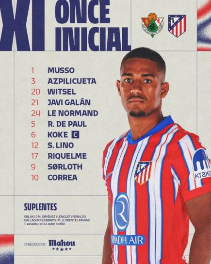 马竞首发:1-穆索、3-阿斯皮利奎塔、20-维特塞尔、21-哈维-加兰、24-勒诺曼德、5-德保罗、6-科克、12-利诺、17-里克尔梅、9-索尔洛特、10-科雷亚
