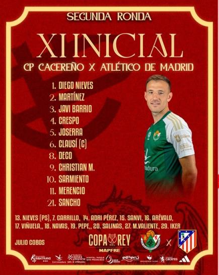 12月6日讯 国王杯第二轮比赛,马竞和低级别联赛球队卡些连奴交手。目前,对阵双方已经公布了首发阵容,马竞方面索尔洛特和科雷亚搭档锋线,德保罗、科克出战。
