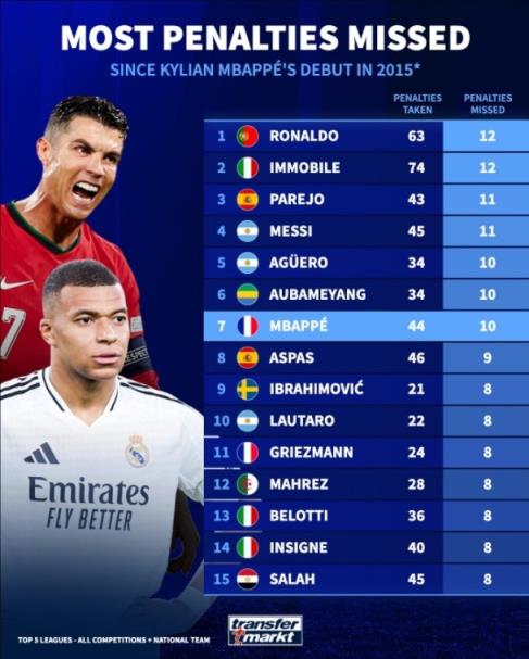 7-姆巴佩 44次罚丢10次