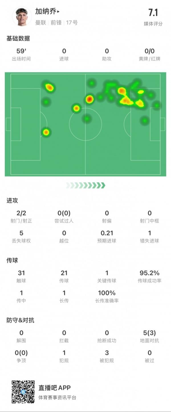 12月8日讯 本轮英超比赛,曼联对阵诺丁汉森林,加纳乔在第59分钟被换下。