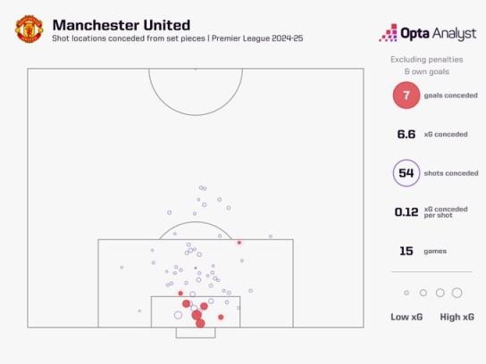数据显示,曼联本赛季在英超联赛中已经在定位球失球7次,这些定位球失球占到球队总失球数的50%,是联赛中定位球失球占比最高的球队。在定位球失球的绝对数量上,只有狼队(11个)和南安普顿(8个)的表现比曼联更差。