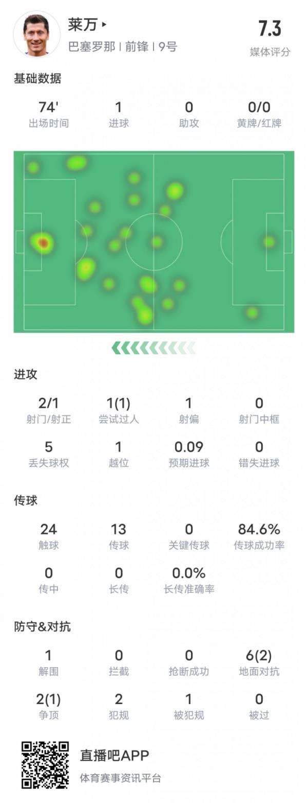 莱万本场比赛数据如下: