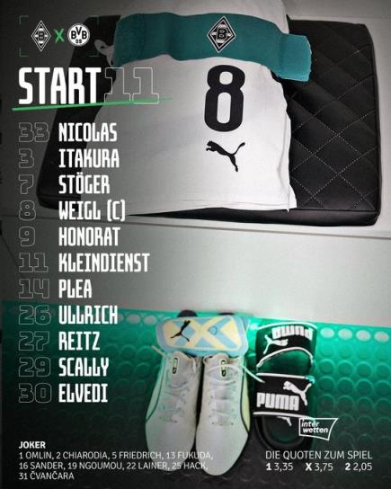 门兴首发:33-莫里茨-尼古拉斯、3-板仓滉、26-卢卡斯-乌尔赖希、27-罗科-赖茨、29-斯卡利、30-埃尔维迪、8-魏格尔、7-斯托格、9-奥诺拉、11-克莱因丁斯特、14-普利亚