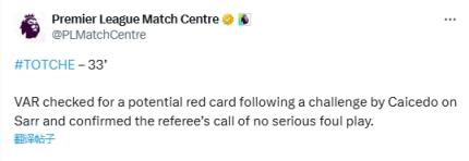 英超官方:“VAR检查了凯塞多对萨尔犯规的可能红牌,认定主裁不是严重犯规的判罚正确。”