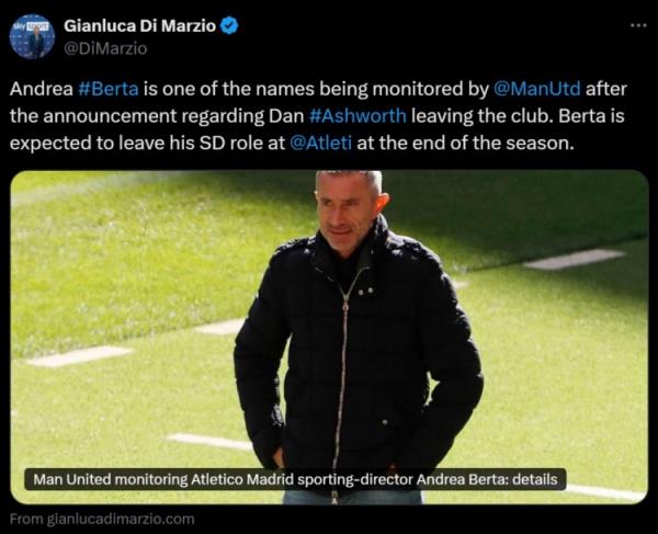 12月9日讯 昨天,曼联官方宣布,体育总监阿什沃斯离职。据意大利名记迪马济奥报道,在阿什沃斯离任后,曼联正在关注潜在的继任者,其中包括马竞体育总监贝尔塔。