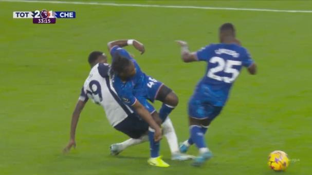 12月09日讯 英超第15轮,伦敦德比,热刺主场迎战切尔西,比赛第33分钟,凯塞多拼抢中踢到萨尔小腿,裁判吹罚犯规但没出牌。