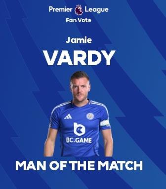 英超官方宣布,37岁的瓦尔迪当选本场比赛最佳球员。