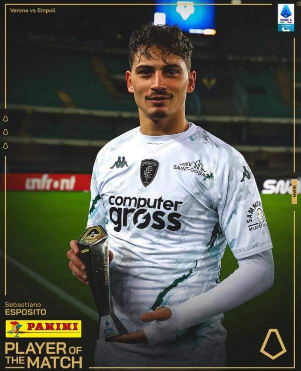 12月9日讯 在刚刚结束的意甲15轮比赛中,恩波利4-1击败维罗纳。赛后,意甲官方宣布,梅开二度的埃斯波西托当选全场最佳球员。