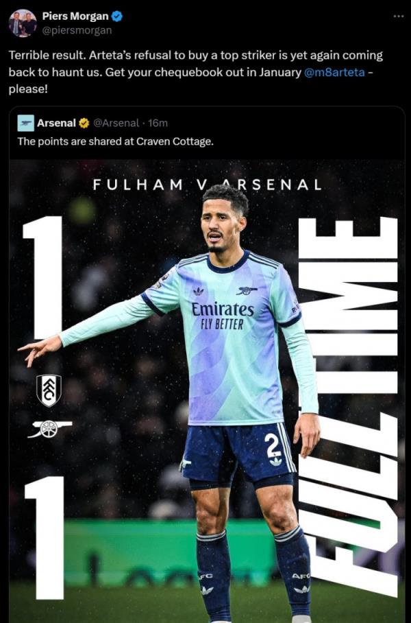 12月9日讯 在刚刚结束的英超第15轮比赛中,阿森纳1-1战平富勒姆。赛后,知名枪迷、英国名嘴皮尔斯-摩根吐槽了球队的表现和阿尔特塔的引援。