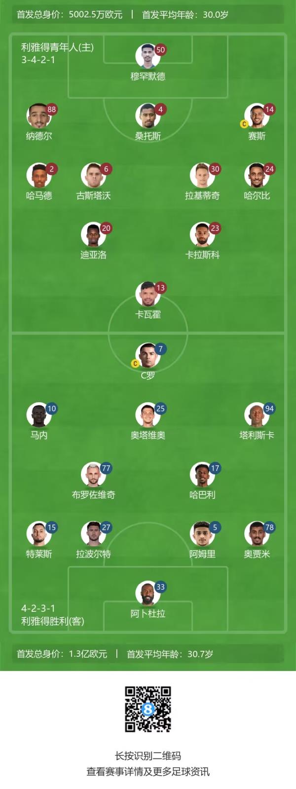 利雅得胜利首发:33-阿卜杜拉、78-奥贾米、5-阿姆里、27-拉波尔特、15-特莱斯、17-哈巴利、25-奥塔维奥、77-布罗佐维奇、94-塔利斯卡、10-马内、7-C罗