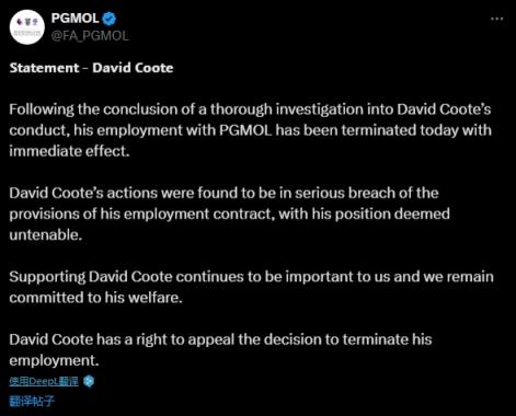 在对大卫-库特的行为进行彻底调查之后,他与PGMOL的雇佣关系已于今日终止,并立即生效。
