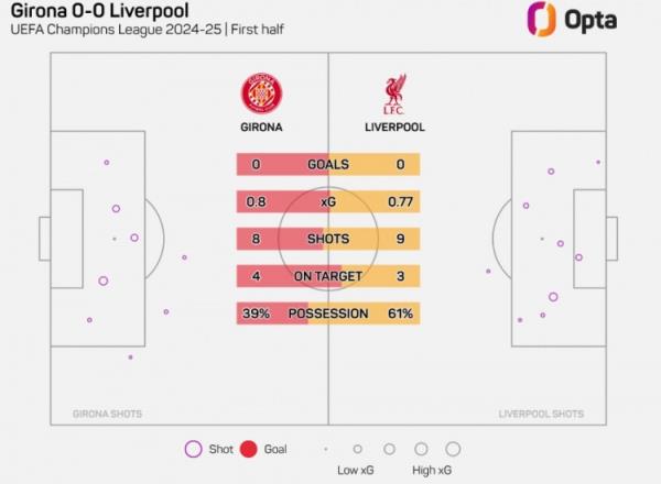 上半场比赛,赫罗纳有8脚射门命中目标的射门数为4脚,他们是本赛季欧冠赛场上面对利物浦上半场比赛射门最多的球队。