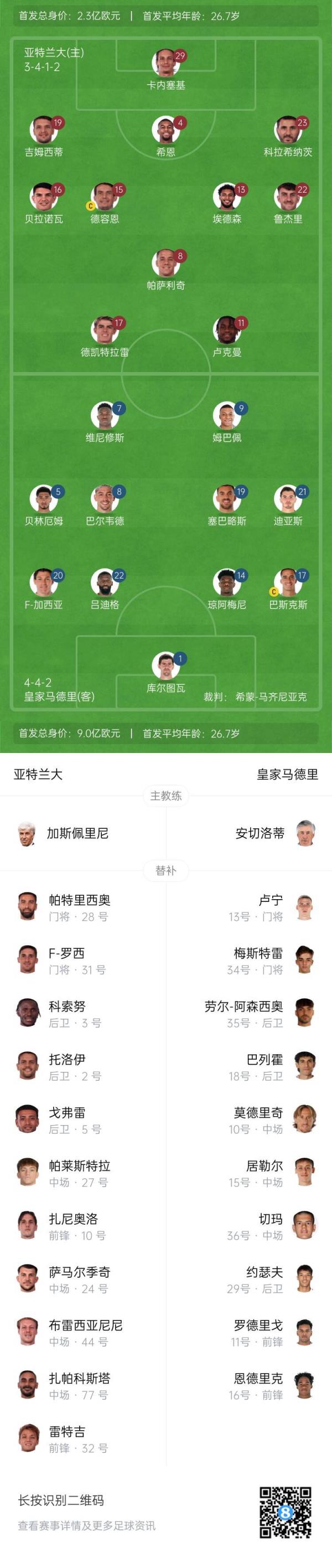 12月11日讯 欧冠联赛阶段第6轮,皇马客场对阵亚特兰大。赛前,官方公布了本场的首发名单。