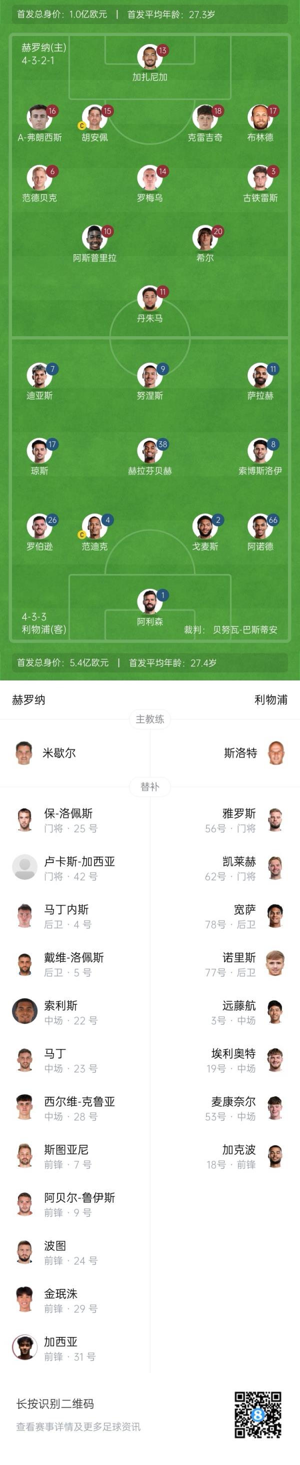 12月11日讯 欧冠联赛阶段第6轮,利物浦客战赫罗纳,赛前首发出炉。