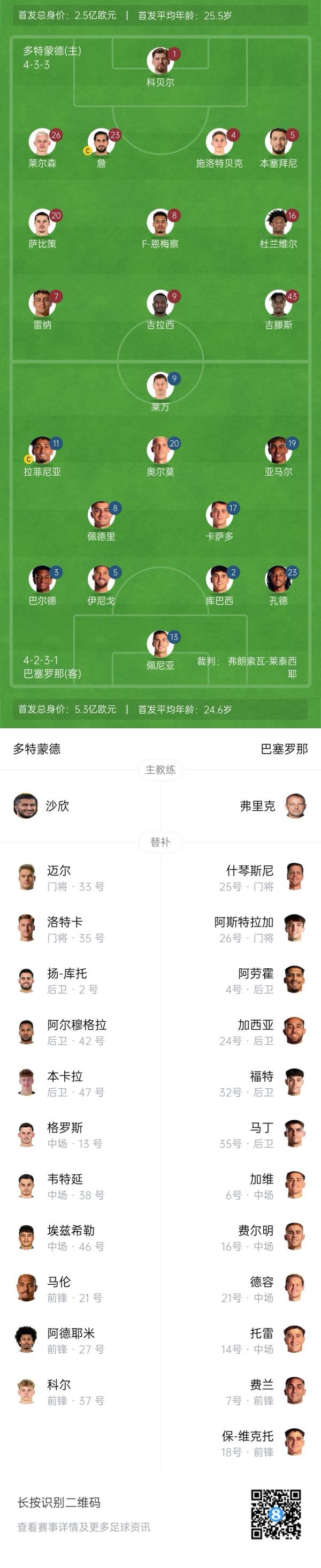 多特首发:1-科贝尔、4-施洛特贝克、5-本塞拜尼、23-埃姆雷-詹、26-莱尔森、8-恩梅查、20-萨比策、16-迪朗维尔、7-雷纳、43-吉滕斯、9-吉拉西