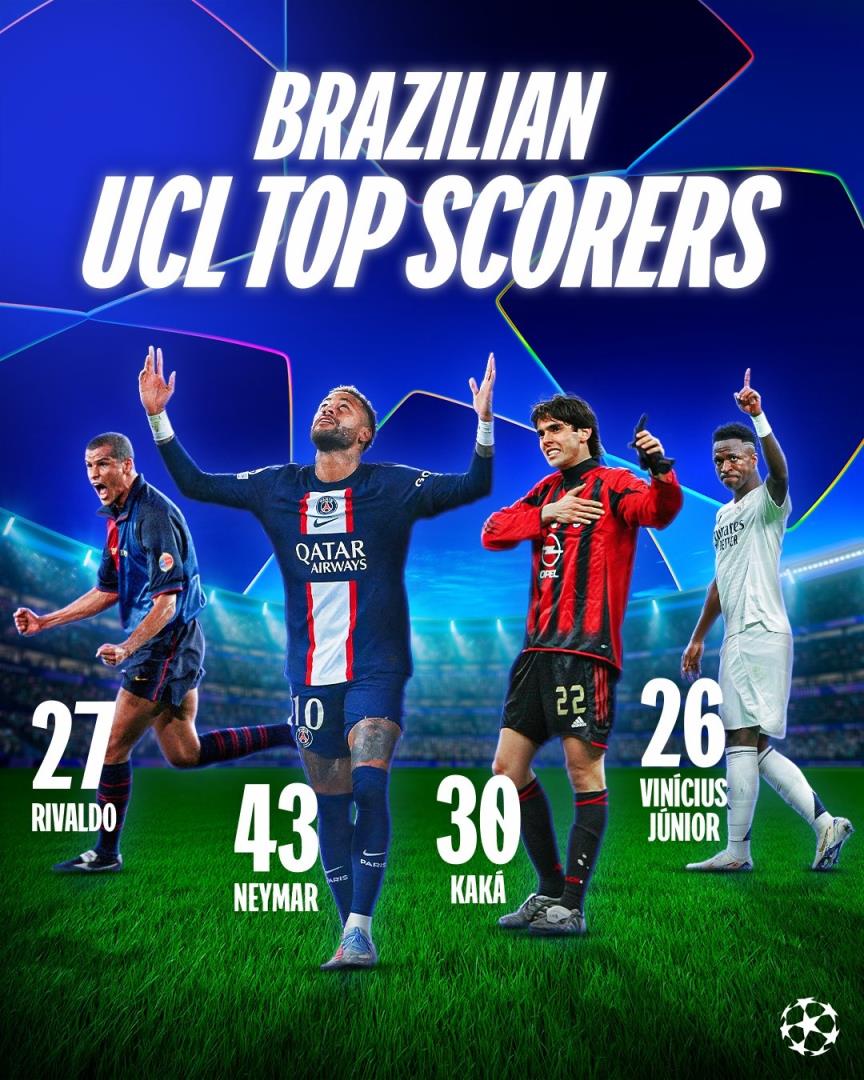 12月12日讯 在昨天结束的欧冠比赛中,皇马3-2击败亚特兰大,刚刚伤愈复出的维尼修斯传射建功。凭借这粒进球,他升至巴西球员欧冠射手榜第4位,内马尔仍然稳居榜首。