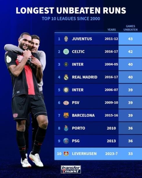 2月27日讯 德转官方社媒列出前十联赛本世纪各项赛事最长不败纪录,尤文43场不败居首,勒沃库森33场不败位居第10。