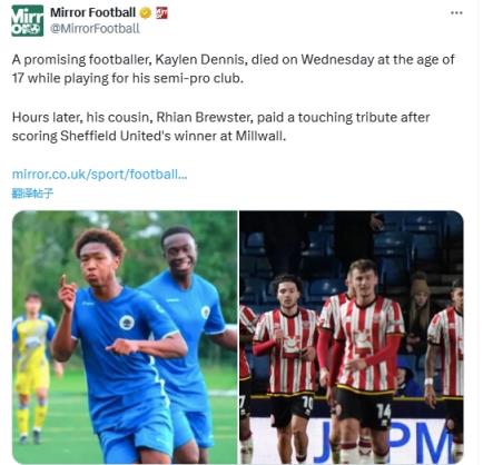 沃尔瑟姆斯托是一家半职业俱乐部,他们在一份声明中写道:“得知我们一名U23球员凯伦-丹尼斯在一场比赛中离世,我们感到非常难过。我们向他的家人、朋友、队友以及所有认识的人表示深深的哀悼。”