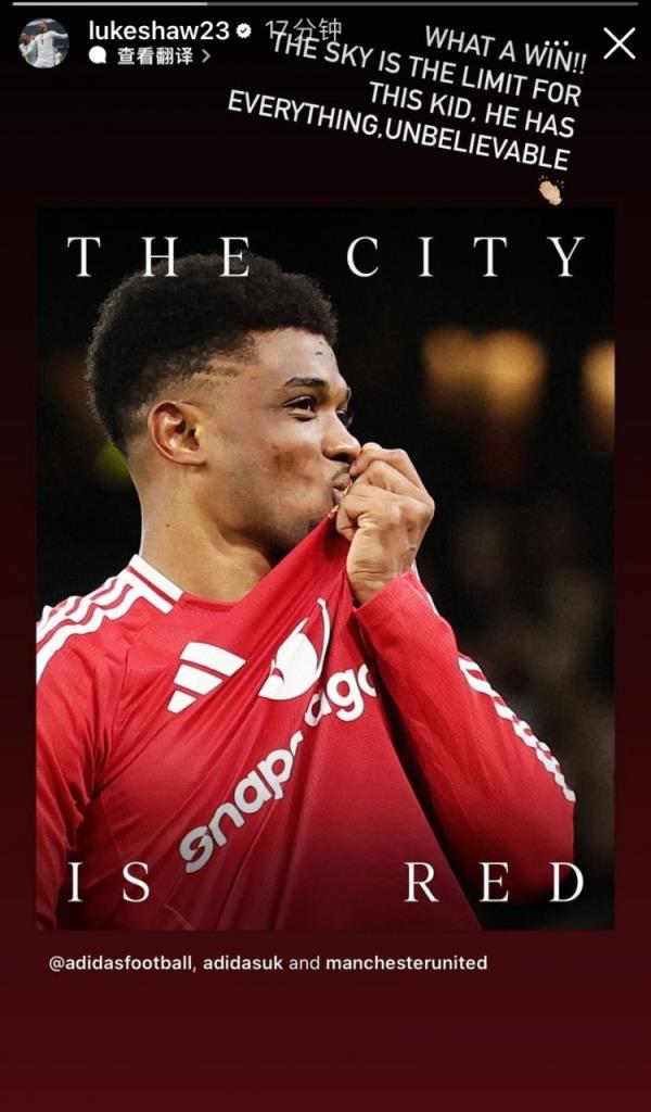 12月16日讯 本轮曼市德比焦点对决,曼联2-1逆转绝杀曼城。赛后,卢克-肖更新社媒,庆祝球队赢下德比战,并称赞了造点+绝杀的阿玛德。
