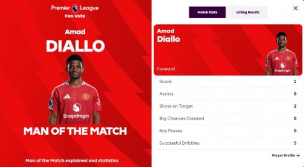 本场比赛,阿玛德打进1球并造点球,是曼联逆转的大功臣,他在比赛中有2次射正,5次成功过人。