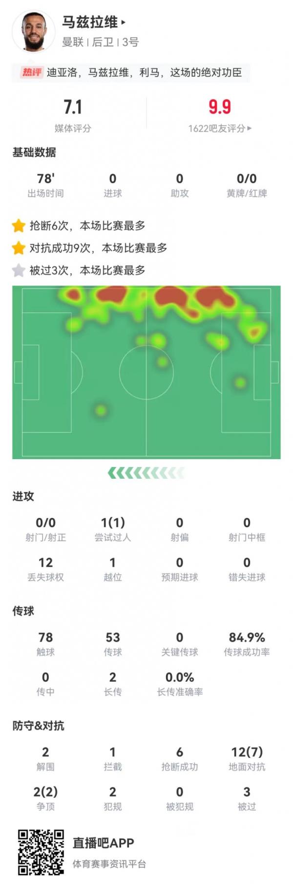 12月16日讯 曼联在本轮英超2-1逆转绝杀曼城,出任右翼卫的马兹拉维本场数据如下:
