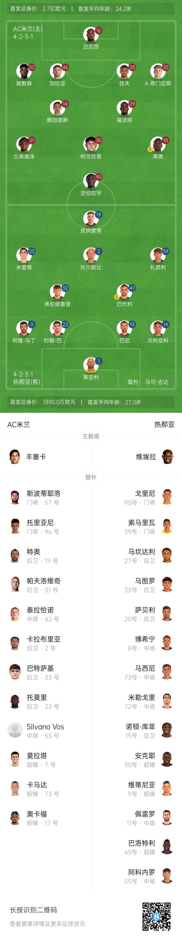 AC米兰首发:16-迈尼昂、22-埃默森、46-加比亚、28-佳夫、20-阿莱克斯-希门尼斯、29-福法纳、14-赖因德斯、21-丘库埃泽、30-利贝拉里、10-莱奥、90-亚伯拉罕