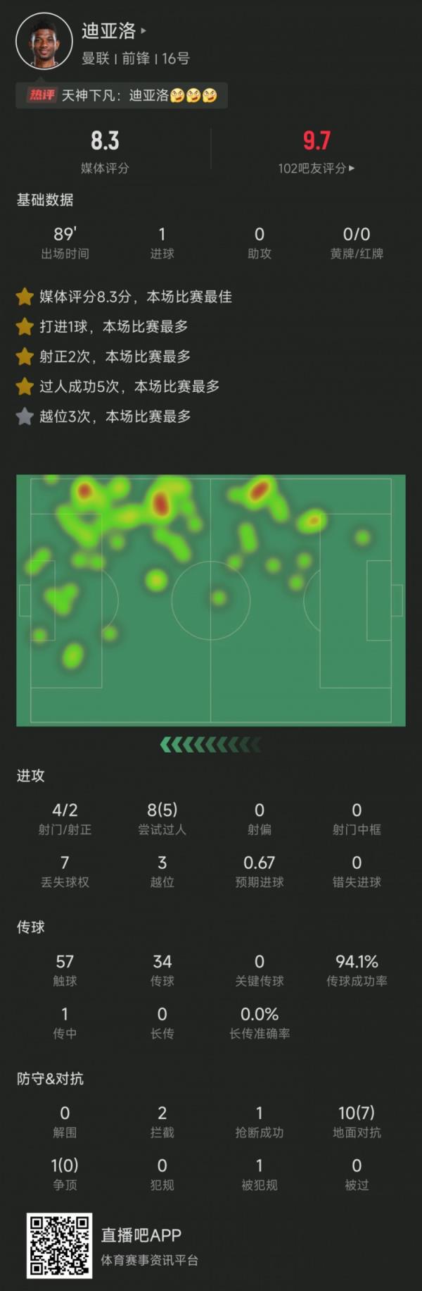 12月16日讯 在刚刚结束的一场英超联赛中,曼联客场2-1逆转击败曼城,迪亚洛打入逆转比分的一球,以下为他本场比赛的数据。