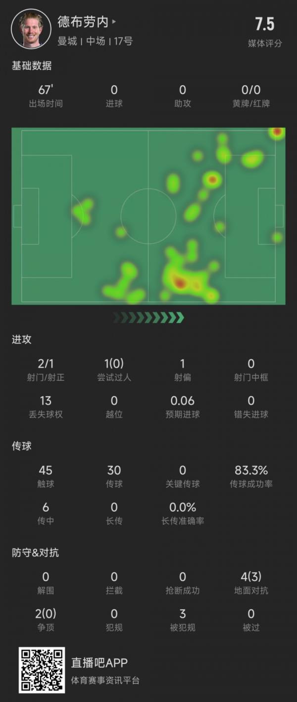 本场比赛,德布劳内首发踢了67分钟,有2次射门1次射正1次射偏,1次过人没成功,13次丢失球权,预期进球0.06球。