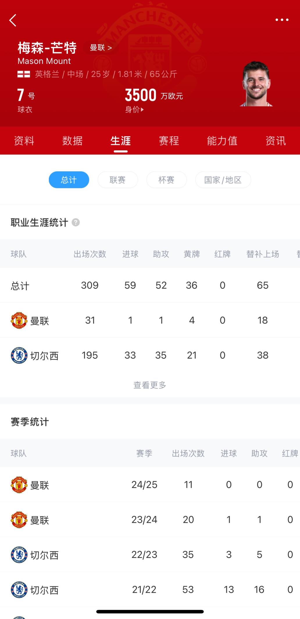 加盟曼联1年半,芒特只为曼联出场31次打进1球助攻1次,根据伤病统计,芒特加盟曼联之后遭遇伤病3次(不算本场),缺席比赛30场!