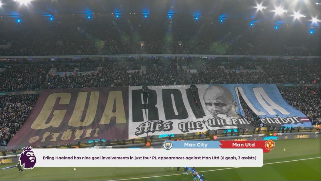 12月16日讯 本轮英超曼市德比焦点战,曼城主场对阵曼联的比赛正在进行。赛前,曼城主场球迷打出了巨幅TIFO,致敬功勋教练瓜迪奥拉。