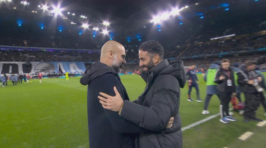 12月16日讯 曼城vs曼联焦点对决即将打响,赛前双方人员入场,瓜迪奥拉和阿莫林在通道口握手拥抱致意。