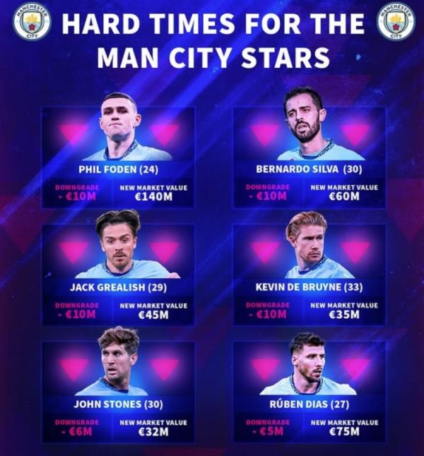 德转今天更新了英超球员身价,曼城6位关键球员共计下降了5100万欧元: