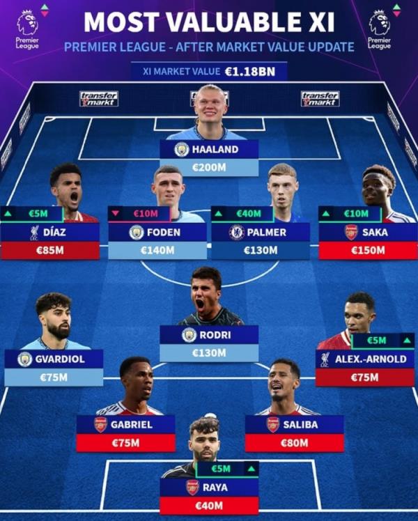 中场:路易斯-迪亚斯(利物浦,8500万)、福登(曼城,1.4亿)、罗德里(曼城,1.3亿)、帕尔默(切尔西,1.3亿)、萨卡(阿森纳,1.5亿)