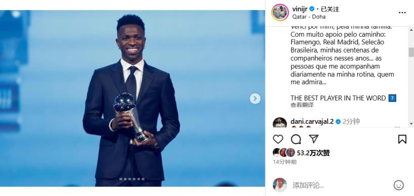 12月18日讯 FIFA年度颁奖典礼,皇马前锋维尼修斯当选2024年度最佳球员(世界足球先生),这是他生涯首次当选。
