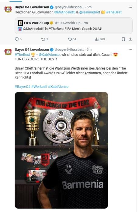 勒沃库森官方表示道:我们真的为哈维-阿隆索感到骄傲,对我们来说,你是最佳。