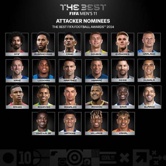阿菲夫(卡塔尔)、奥巴梅扬(加蓬)、卡诺(阿根廷)、多夫比克(乌克兰)、约克雷斯(瑞典)、哈兰德(挪威)、凯恩(英格兰)、卢克曼(尼日利亚)、劳塔罗(阿根廷)、姆巴佩(法国)、梅西(阿根廷)、穆西亚拉(德国)、拉希米(摩洛哥)、罗德里戈(巴西)、C罗(葡萄牙)、隆东(委内瑞拉)、萨卡(英格兰)、苏亚雷斯(乌拉圭)、维尼修斯(巴西)、沃特金斯(英格兰)、尼科-威廉姆斯(西班牙)、亚马尔(西班牙)