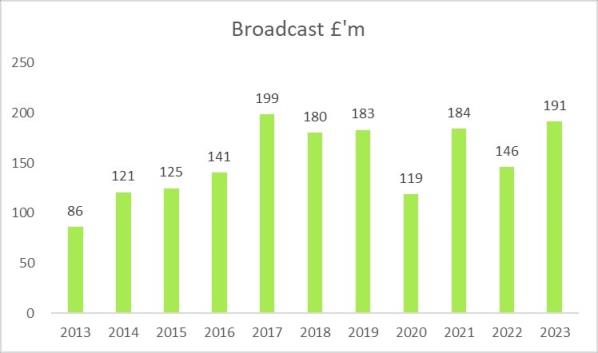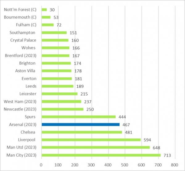 由于在英超联赛中有着更高的排名(每个位置价值310万英镑)和参与欧战,阿森纳在2022-23赛季的转播收入达到了1.91亿英镑,涨幅高达31%。