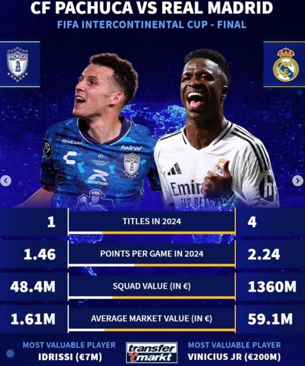 12月19日讯 欧冠冠军皇马在今日洲际杯决赛对阵中北美冠军帕丘卡,《转会市场》也对比了双方情况。