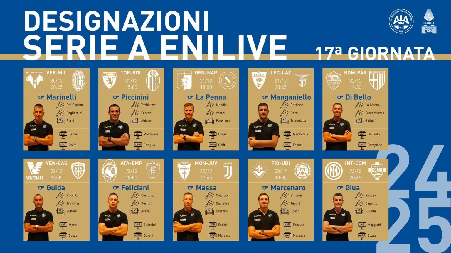 12月20日讯 意甲第17轮各场执法裁判公布,马萨执法蒙扎尤文,迪贝洛执法罗马帕尔马。