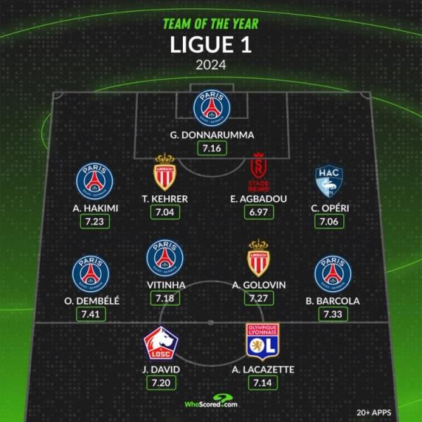 12月20日讯 2024年接近尾声,whoscored也统计了本年度法甲评分最佳阵容,巴黎5将在列。