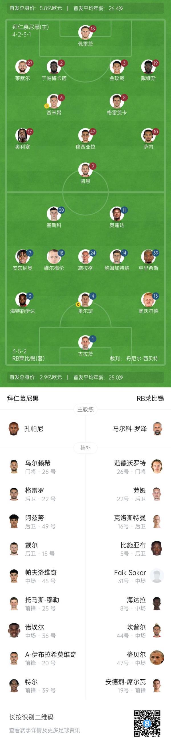 拜仁首发:18-佩雷茨、27-莱默尔、2-于帕梅卡诺、3-金玟哉、19-阿方索-戴维斯、6-基米希、8-格雷茨卡、42-穆西亚拉、10-萨内、17-奥利塞、9-凯恩