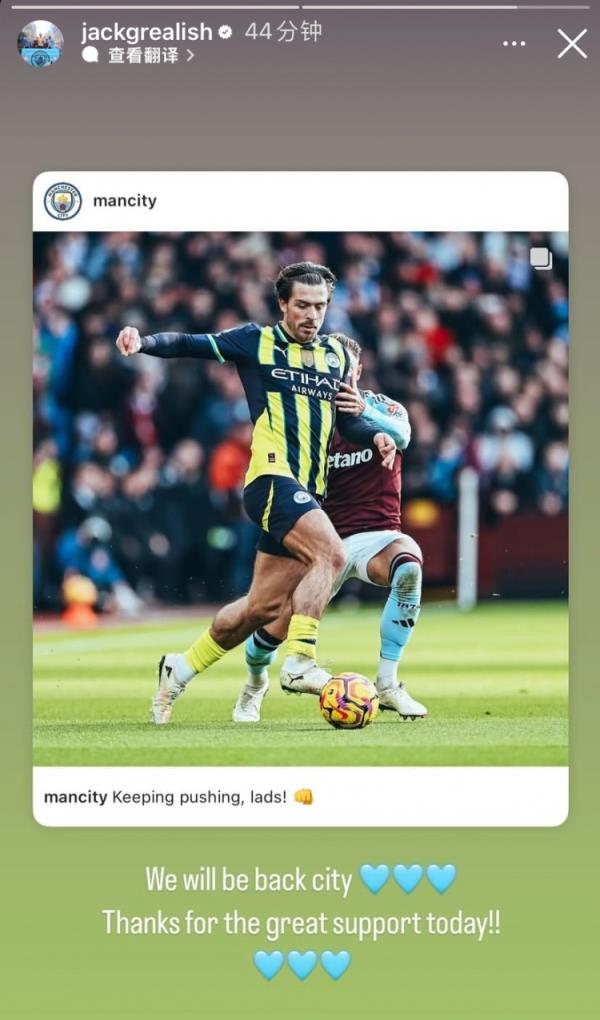 赛后,他更新了社媒鼓舞士气。格拉利什写道:我们会回来的,曼城,感谢你们今天的大力支持!!