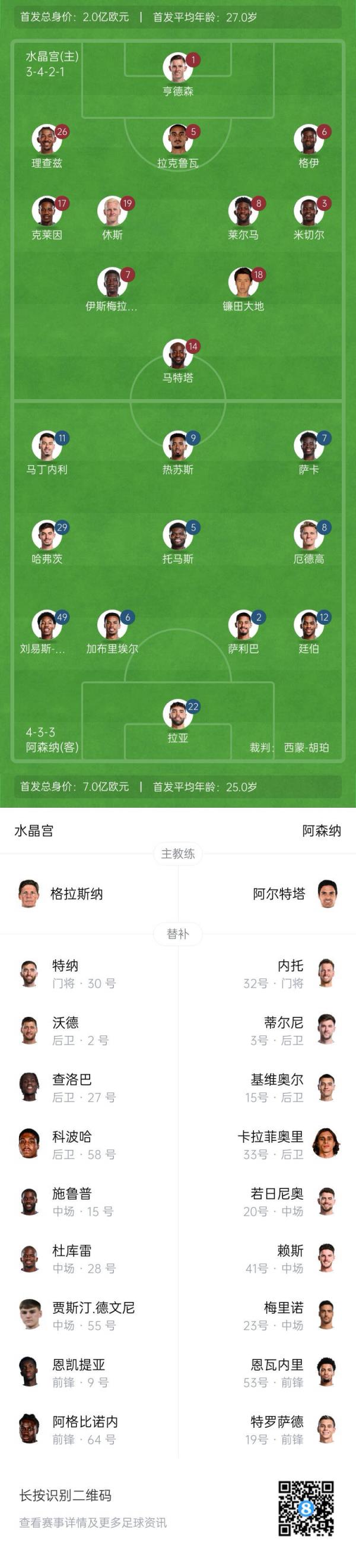 水晶宫首发:1-迪恩-亨德森、17-克莱因、26-克里斯-理查兹、5-拉克洛瓦、6-格伊、3-米切尔、8-莱尔马、19-威尔-休斯、18-镰田大地、7-伊斯梅拉-萨尔、14-马特塔