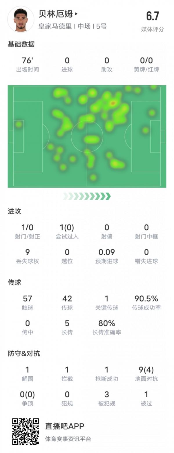 12月23日讯 西甲第18轮,皇马主场对阵塞维利亚,贝林厄姆首发出战,送出1次关键传球,传球成功率达到90.5%,评分6.7。