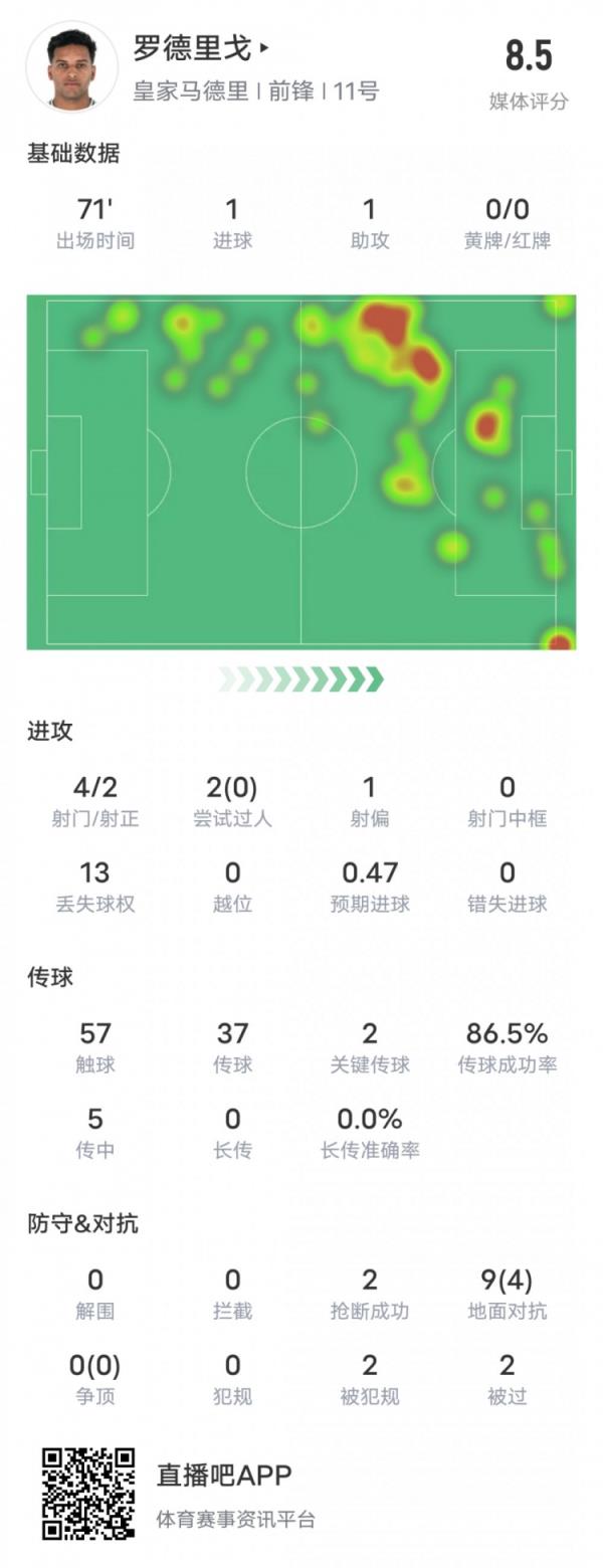 12月23日讯 西甲第18轮,皇马对阵塞维利亚,罗德里戈本场比赛首发出战,传射建功,另外他还送出2次关键传球,评分8.5。