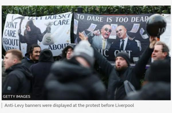 12月23日讯 英超第17轮焦点战,热刺主场对阵利物浦。据BBC报道,热刺球迷发起了反对主席列维的抗议活动,有250-300人参加。