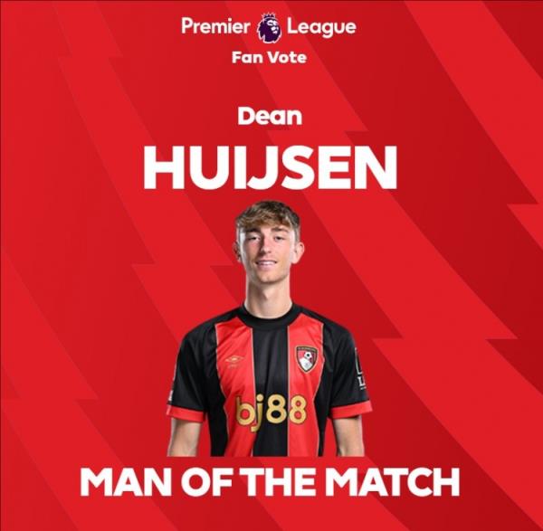 12月23日讯 英超官方消息,怀森当选伯恩茅斯3-0曼联球迷票选全场最佳球员。