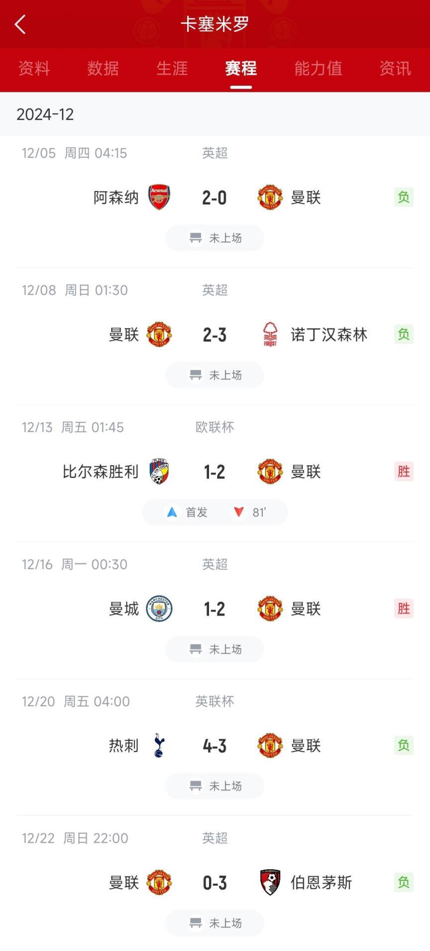 12月23日讯 英超第17轮,曼联主场0-3完败于伯恩茅斯,此役卡塞米罗枯坐板凳90分钟。曼联最近6场比赛,卡塞米罗只获得一次出场机会,其中4场英超全部未登场,曼联仅取得1胜3负的战绩!