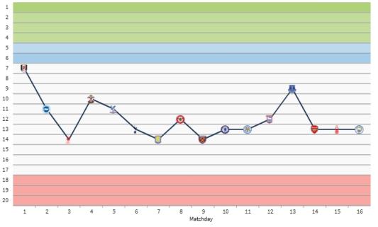 曼联本赛季的最高排名是在第1轮结束后排在第7,在上个月4-0大胜埃弗顿后,曼联也曾排在英超第9,其余时间曼联的排名基本都在10名开外。
